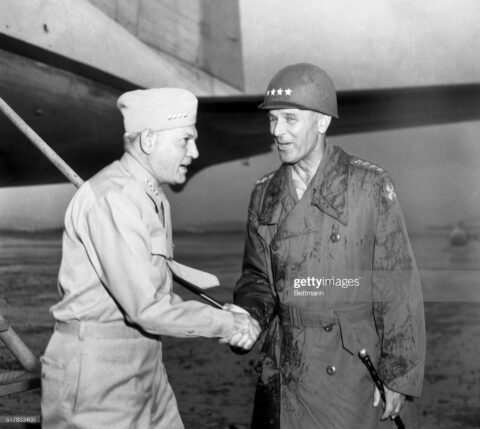 “(Original Caption) Eight army commander Gen. Maxwell Taylor (left) shakes hands with Marine Corps commander General Lemuel C Shepherd at Seoul during Shepherd’s tour of marine units in the Far…