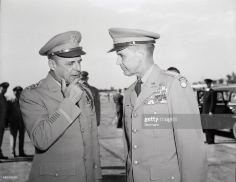 “(Original Caption) General Matthew B. Ridgway (left), retiring Army Chief of Staff, is shown in serious conversation with General Maxwell D. Taylor, who will succeed him July 1. The picture…