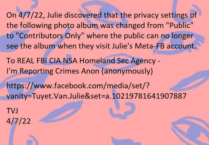 On 4/7/22, Julie discovered that the privacy settings of the following photo album was changed from “Public” to “Contributors Only” where the public can no longer see the album when they visit Julie’s Meta-FB account.