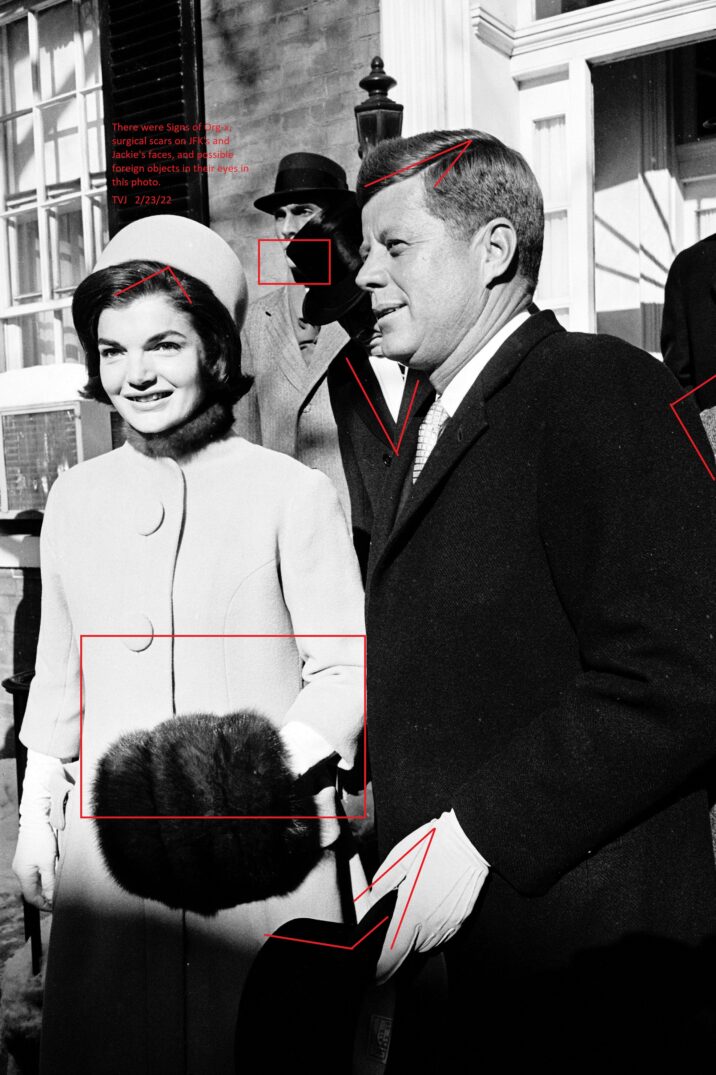There were Signs of Org-x, surgical scars on JFK’s and Jackie’s faces, and possible foreign objects in their eyes in this photo.