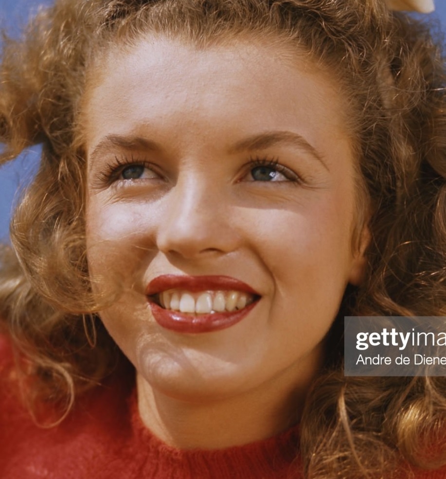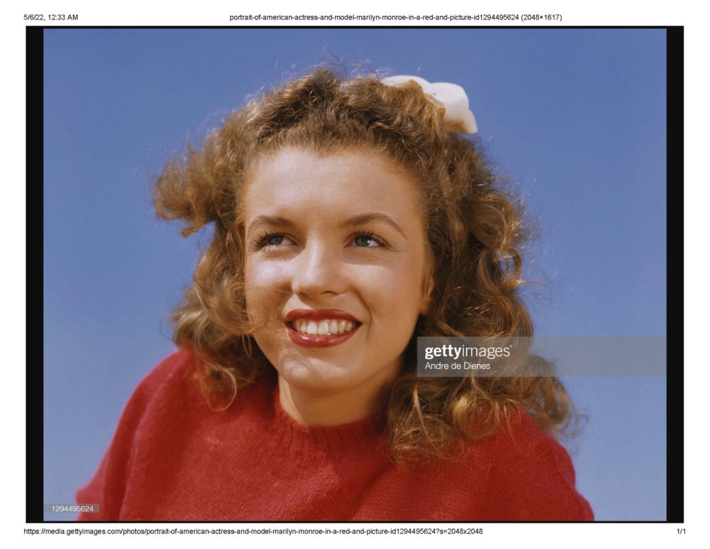 Portrait of AmericaMarilyn Monroe (born Norma Jeane Mortenson) in 1945.n actress and model Marilyn Monroe (born Norma Jeane Mortenson, 1926 – 1962) in a red sweater and checkered trousers, as she poses at Zuma Beach’s Paradise Cove, California, 1945. (Photo by Andre de Dienes/MUUS Collection via Getty Images). Date created: January 01, 1945.”