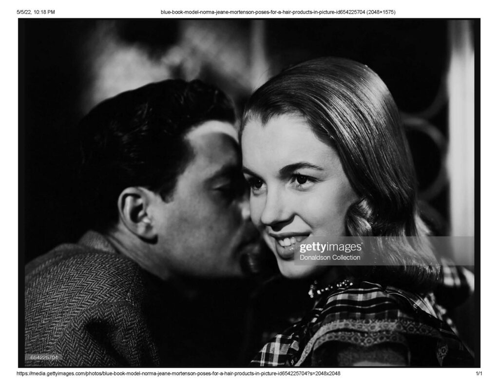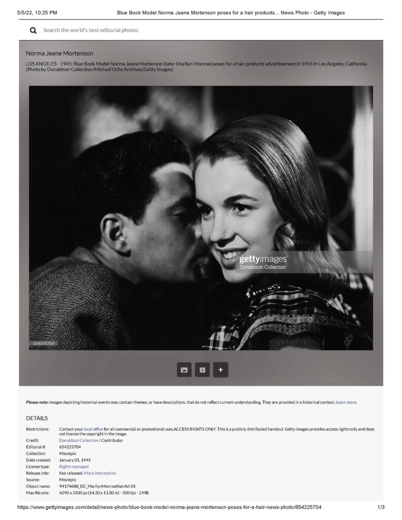 LOS ANGELES – 1945: Blue Book Model Norma Jeane Mortenson (later Marilyn Monroe) poses for a hair products advertisement in 1945 in Los Angeles, California. (Photo by Donaldson Collection/Michael Ochs Archives/Getty Images). Date created: January 01, 1945.”
