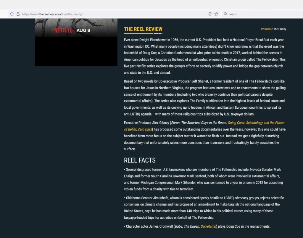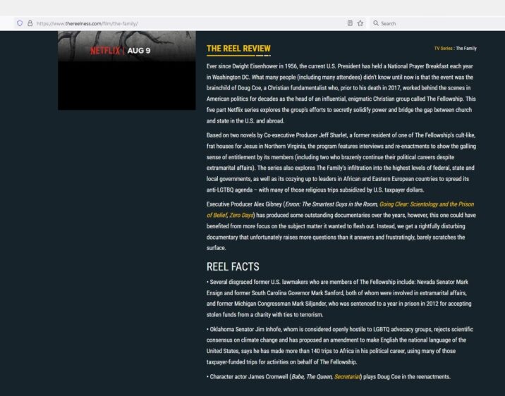 Based on two novels by Co-executive Producer Jeff Sharlet, a former resident of one of The Fellowship’s cult-like, frat houses for Jesus in Northern Virginia, the program features interviews and re-enactments to show the galling sense of entitlement by its members (including two who brazenly continue their political careers despite extramarital affairs). The series also explores The Family’s infiltration into the highest levels of federal, state and local governments, as well as its cozying up to leaders in African and Eastern European countries to spread its anti-LGTBQ agenda – with many of those religious trips subsidized by U.S. taxpayer dollars.