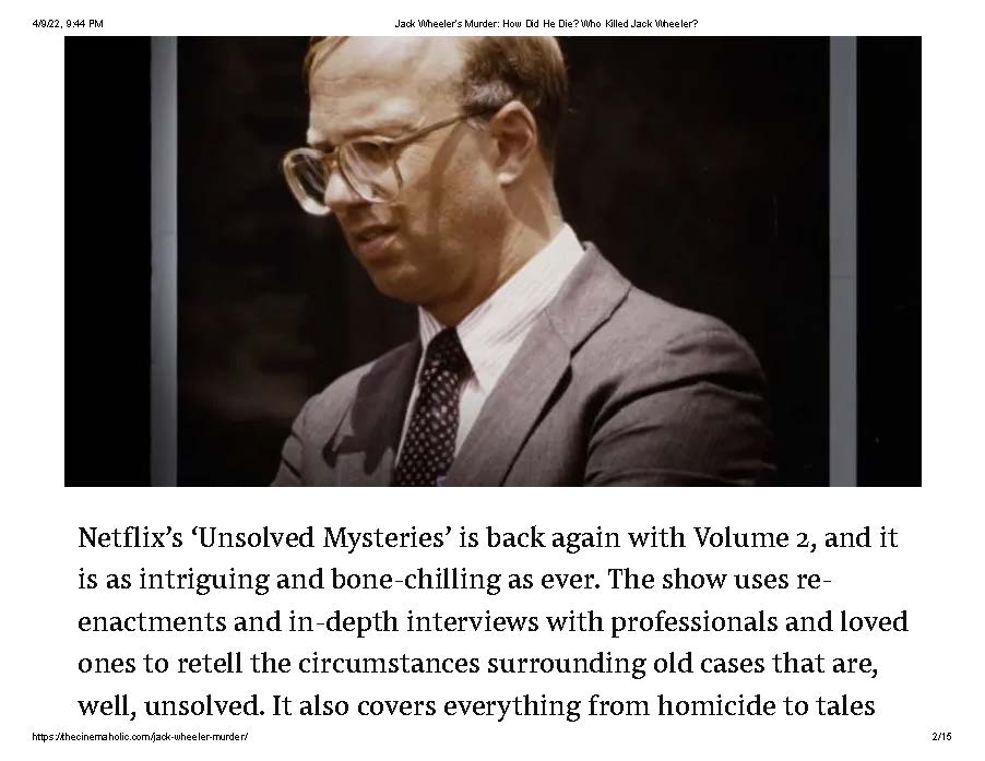Posted in John "Jack" Parsons Wheeler, III, Vietnam Veterans Jack Wheeler on Netflix’s Unsolved Mysteries April 10, 2022 Leave a comment “Jack Wheeler. Image Credit: Netflix.” Jack Wheeler’s Murder: How Did He Die? Who Killed Him? https://thecinemaholic.com/wp-content/uploads/2020/10/jack-wh.jpg