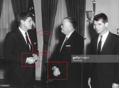 In this photo, there were: Surgical scars on John F. Kennedy’s, Robert Kennedy’s, and J. Edgar Hoover’s faces. Foreign objects in Robert Kennedy’s and J. Edgar Hoover’s eyes. There might…