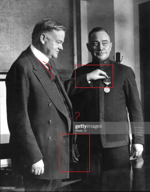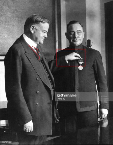 There were Signs of Org-x and surgical scars on Herbert Hoover’s face in this photo. — TVJ — 3/18/22 — “Herbert Hoover, Secretary of Commerce, decorating Captain N.C. Manyon with…