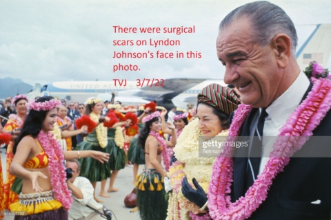 There were surgical scars on Lyndon Johnson’s face in this photo. — TVJ — 3/7/22 — “President Lyndon B. Johnson Arriving in Hawaii. (Original Caption) President Lyndon Johnson is greeted…