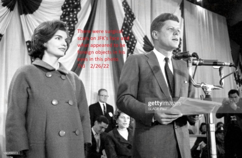 There were surgical scars on JFK’s face and what appeared to be foreign objects in his eyes in this photo. The Getty Images’ description in French might make it more…
