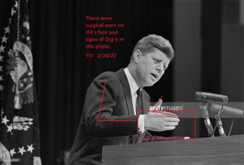 There were surgical scars on JFK’s face, foreign objects in his eyes, and Signs of Org-x in this photo. Signs: Hand covering the knuckles of the other hand. — TVJ…