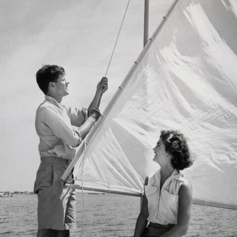 “John Kennedy and Jacqueline Bouvier on Sailboat. (Original Caption) 6/27/1953- Hyannis Port, MA: Senator John F. Kennedy (D-MA) and his fiancee Miss Jacqueline Bouvier of Newport, relaxing at the Kennedy’s…