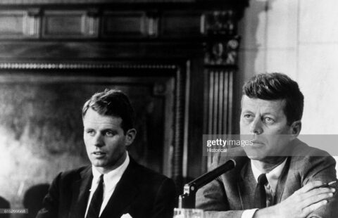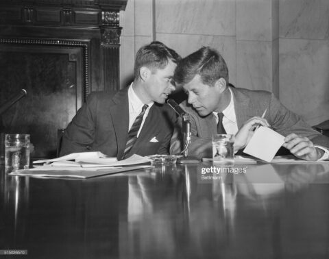 “Robert Kennedy and John F. Kennedy at the Mclelllan Hearings, aimed at the Teamsters Union and its leader, Jimmy Hoffa. May 17, 1957. (Photo by © CORBIS/Corbis via Getty Images)….