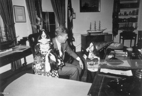 “Date created: January 01, 1963. Halloween 1963. 1963: US President John F Kennedy (1917 -1963) sits behind his desk, laughing as his children Caroline and John Jr (1960 -1999), show…