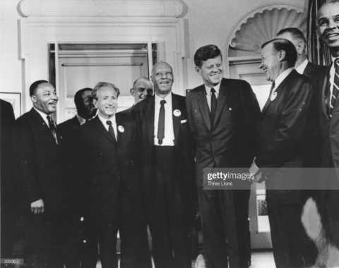 “Civil Rights Leaders Meet With John F. Kennedy28th August 1963: American president John F. Kennedy in the White House with leaders of the civil rights ‘March on Washington’ (left to…