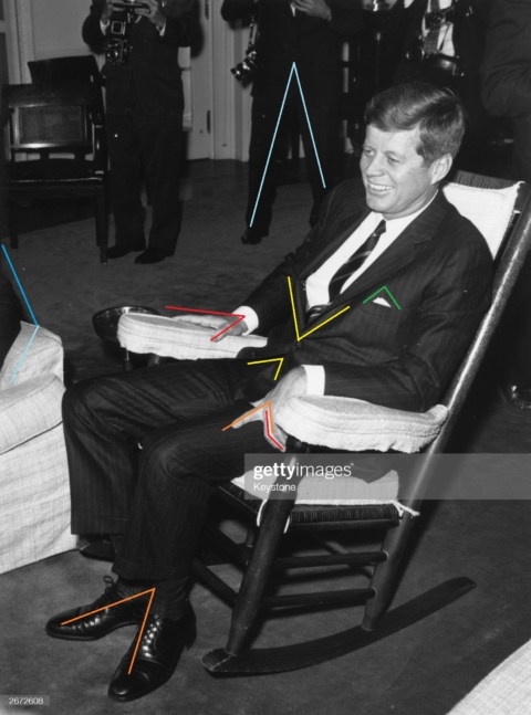 There were surgical scars on JFK’s face and sparkles in his eyes that might not have been reflections of the light in this photo. JFK was making signs generally associated…