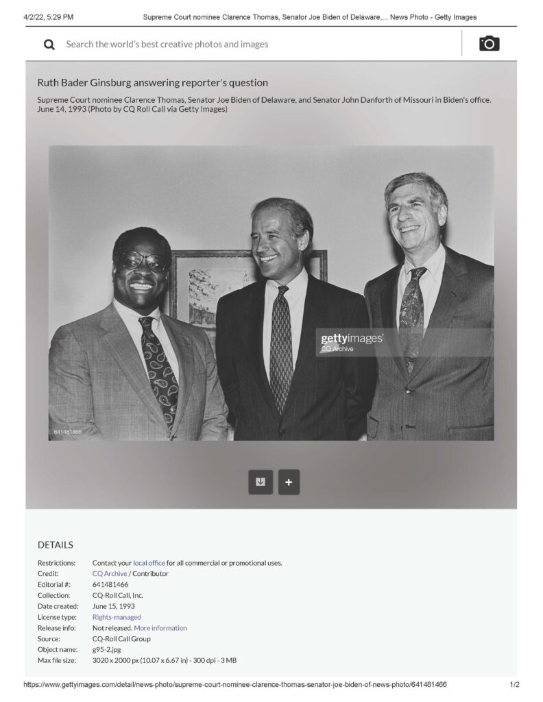 Supreme Court nominee Clarence Thomas, Senator Joe Biden of Delaware, and Senator John Danforth of Missouri in Biden’s office. June 14, 1993 (Photo by CQ Roll Call via Getty Images). Date created: June 15, 1993.”