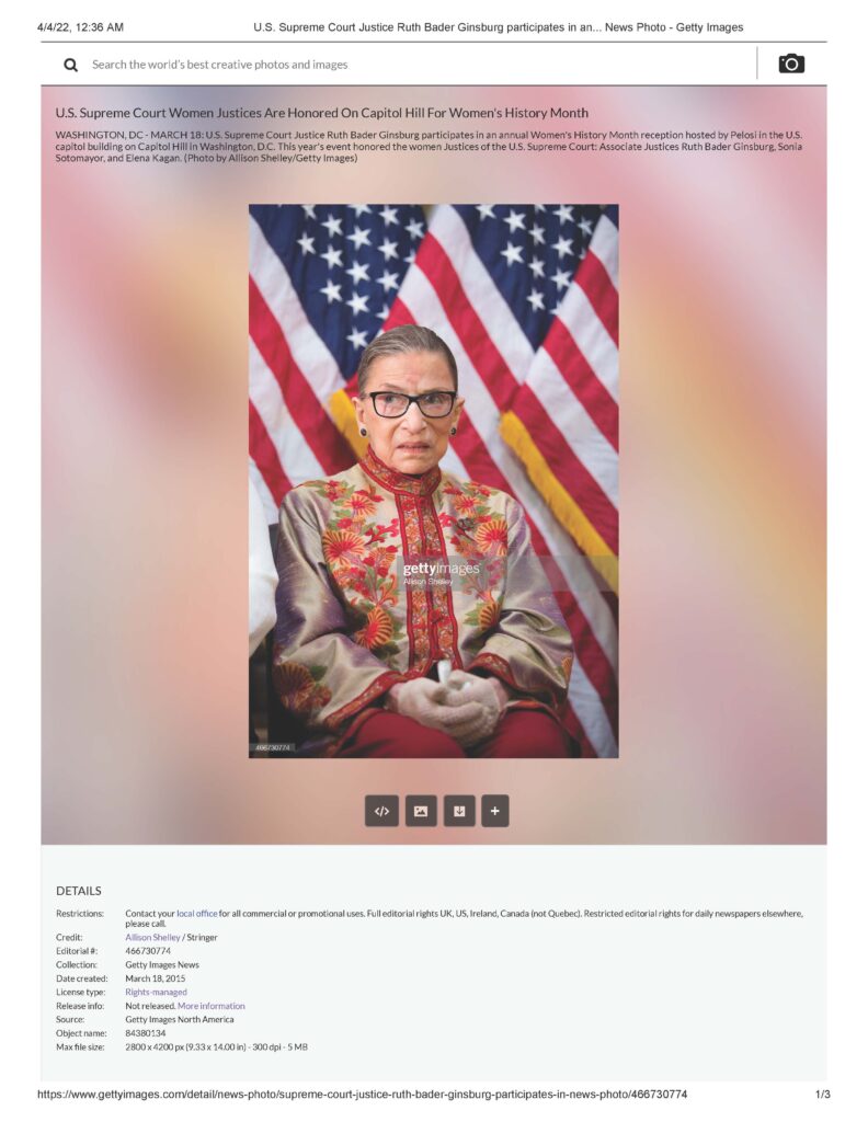 WASHINGTON, DC – MARCH 18: U.S. Supreme Court Justice Ruth Bader Ginsburg participates in an annual Women’s History Month reception hosted by Pelosi in the U.S. capitol building on Capitol Hill in Washington, D.C. This year’s event honored the women Justices of the U.S. Supreme Court: Associate Justices Ruth Bader Ginsburg, Sonia Sotomayor, and Elena Kagan. (Photo by Allison Shelley/Getty Images). Date created: March 18, 2015.”