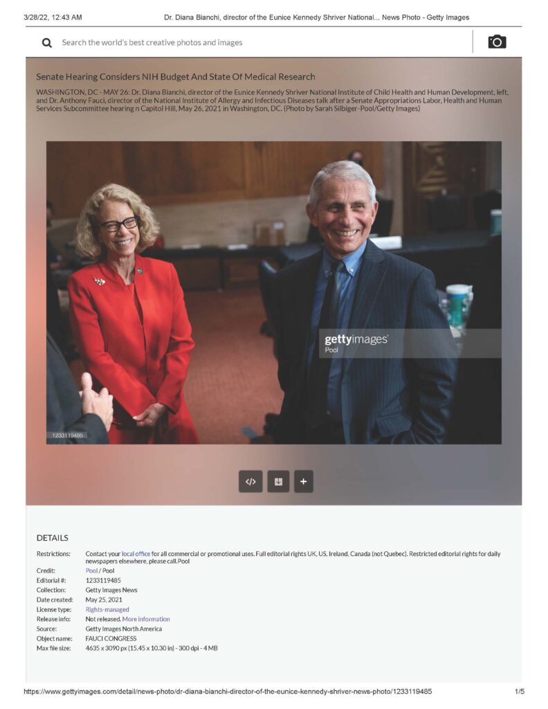 WASHINGTON, DC – MAY 26: Dr. Diana Bianchi, director of the Eunice Kennedy Shriver National Institute of Child Health and Human Development, left, and Dr. Anthony Fauci, director of the National Institute of Allergy and Infectious Diseases talk after a Senate Appropriations Labor, Health and Human Services Subcommittee hearing n Capitol Hill, May 26, 2021 in Washington, DC. (Photo by Sarah Silbiger-Pool/Getty Images). Date created: May 25, 2021.”
