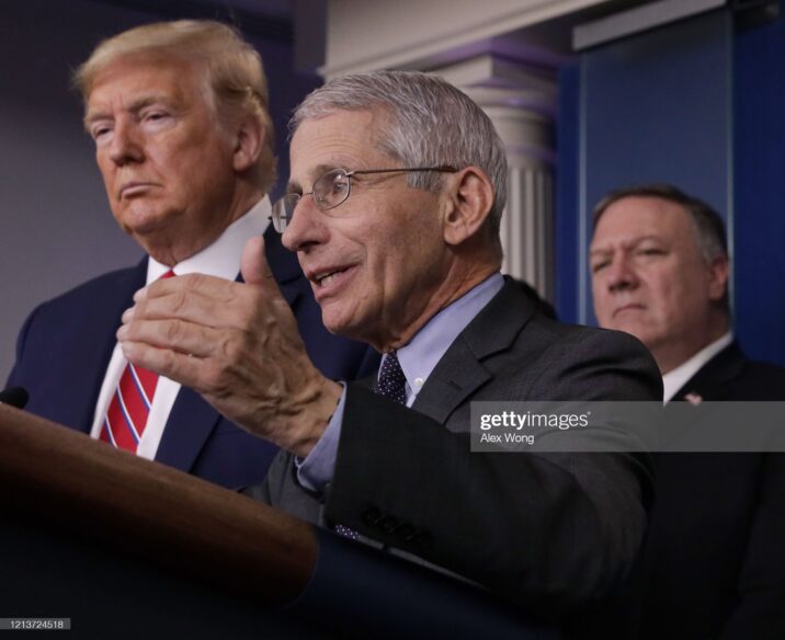 WASHINGTON, DC – MARCH 20: Dr. Anthony Fauci (C) director of the National Institute of Allergy and Infectious Diseases speaks while U.S. President Donald Trump (L) and Secretary of State Mike Pompeo (R) listen during a briefing on the latest development of the coronavirus outbreak in the U.S. in the James Brady Press Briefing Room at the White House March 20, 2020 in Washington, DC. With deaths caused by the coronavirus rising and foreseeable economic turmoil, the Senate is working on legislation for a $1 trillion aid package to deal with the COVID-19 pandemic. President Trump announced that tax day will be delayed from April 15 to July 15. (Photo by Alex Wong/Getty Images). Date created: March 19, 2020.”