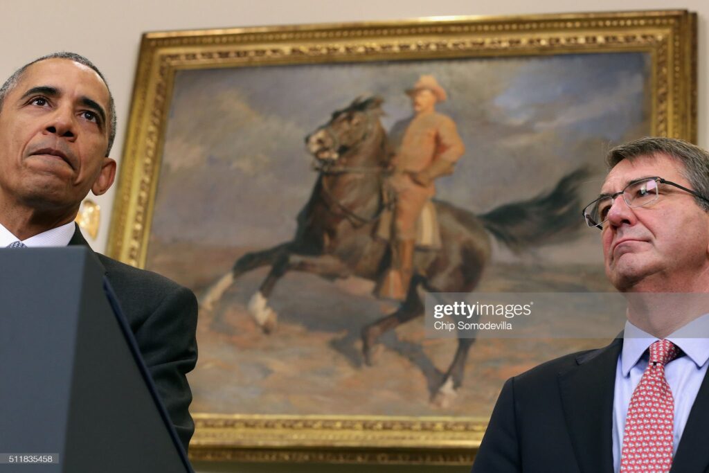 WASHINGTON, DC – FEBRUARY 23: With a painting of former President Theodore Roosevelt on horseback behind them, Defense Secretary Ashton Carter (R) joins President Barack Obama as he makes a statement about his plan to close the detention camp at the Guantanamo Bay Naval Base and relocate the terrorism suspects there to the United States in the Roosevelt Room at the White House February 23, 2016 in Washington, DC. Attempting to follow through with a campaign pledge he made in 2008, Obama will continue to face an uphill battle to close the prison in Cuba because of strong opposition to the plan by congressional Republicans. (Photo by Chip Somodevilla/Getty Images). Date created: February 23, 2016.”