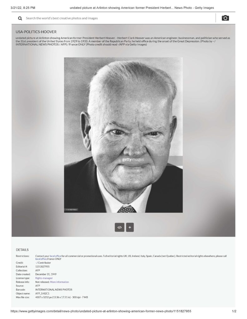undated picture at Arlinton showing American former President Herbert Hoover. – Herbert Clark Hoover was an American engineer, businessman, and politician who served as the 31st president of the United States from 1929 to 1933. A member of the Republican Party, he held office during the onset of the Great Depression. (Photo by – / INTERNATIONAL NEWS PHOTOS / AFP) / France ONLY (Photo credit should read -/AFP via Getty Images). Date created: December 31, 1949.”
