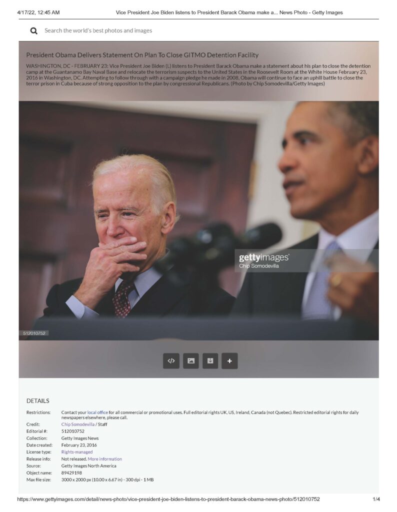 WASHINGTON, DC – FEBRUARY 23: Vice President Joe Biden (L) listens to President Barack Obama make a statement about his plan to close the detention camp at the Guantanamo Bay Naval Base and relocate the terrorism suspects to the United States in the Roosevelt Room at the White House February 23, 2016 in Washington, DC. Attempting to follow through with a campaign pledge he made in 2008, Obama will continue to face an uphill battle to close the terror prison in Cuba because of strong opposition to the plan by congressional Republicans. (Photo by Chip Somodevilla/Getty Images). Date created: February 23, 2016.”