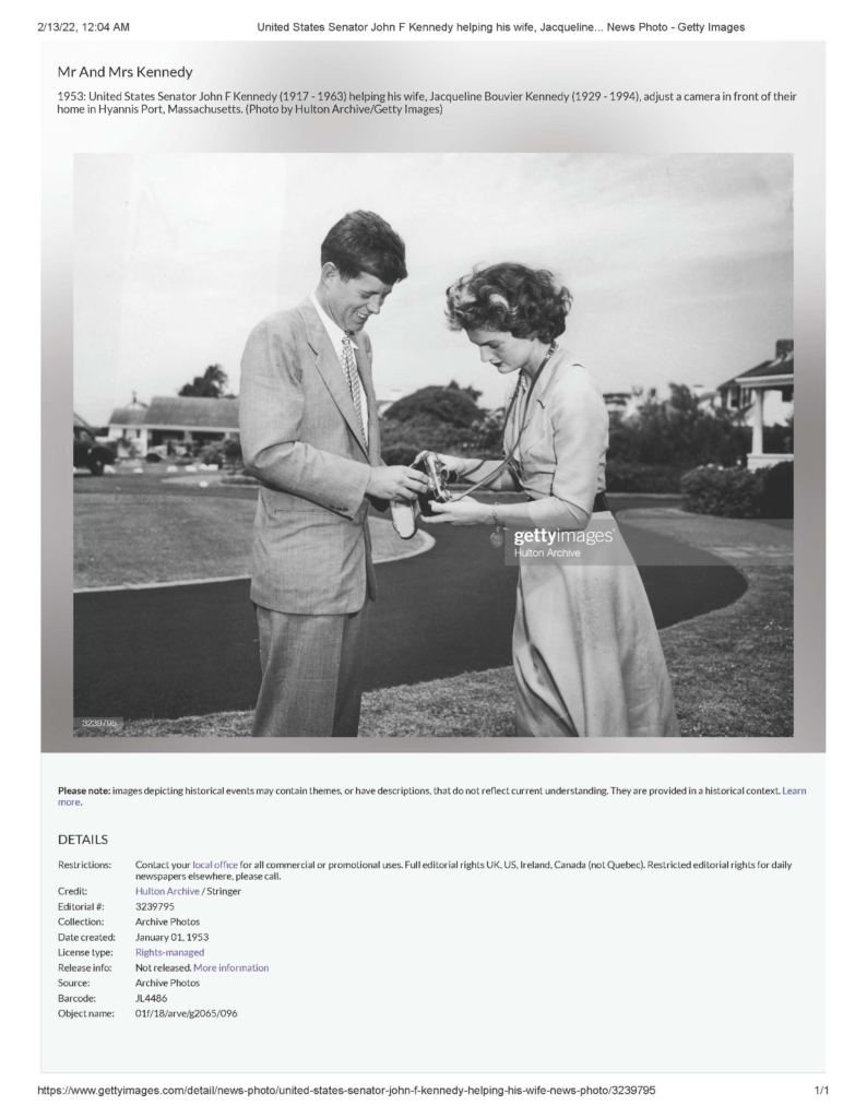 1953: United States Senator John F Kennedy (1917 – 1963) helping his wife, Jacqueline Bouvier Kennedy (1929 – 1994), adjust a camera in front of their home in Hyannis Port, Massachusetts. (Photo by Hulton Archive/Getty Images). Date created: January 01, 1953.”