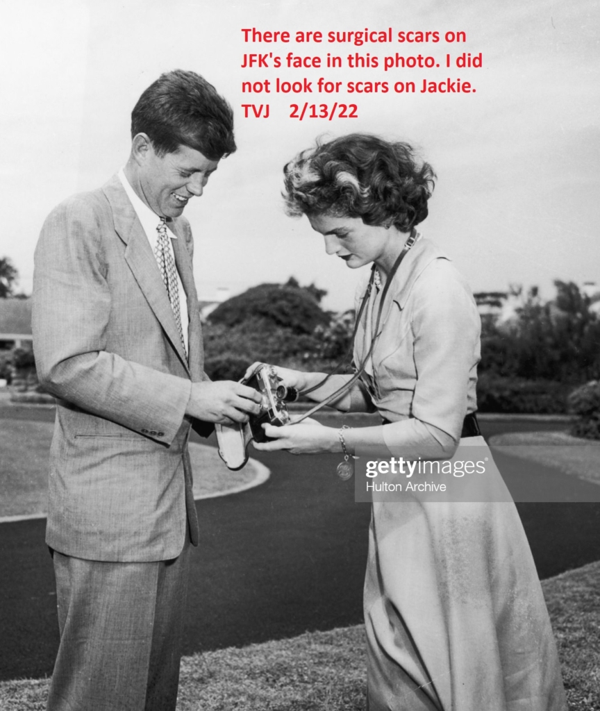 There are surgical scars on JFK’s face in this photo. I did not look for scars on Jackie.