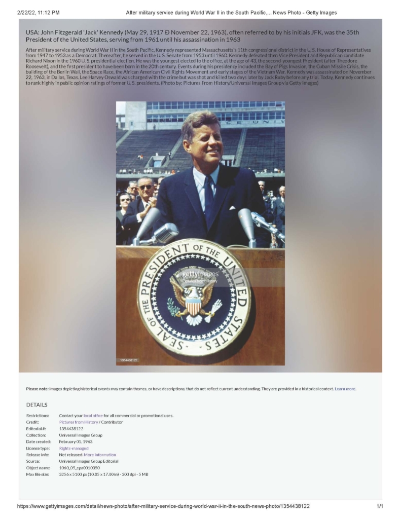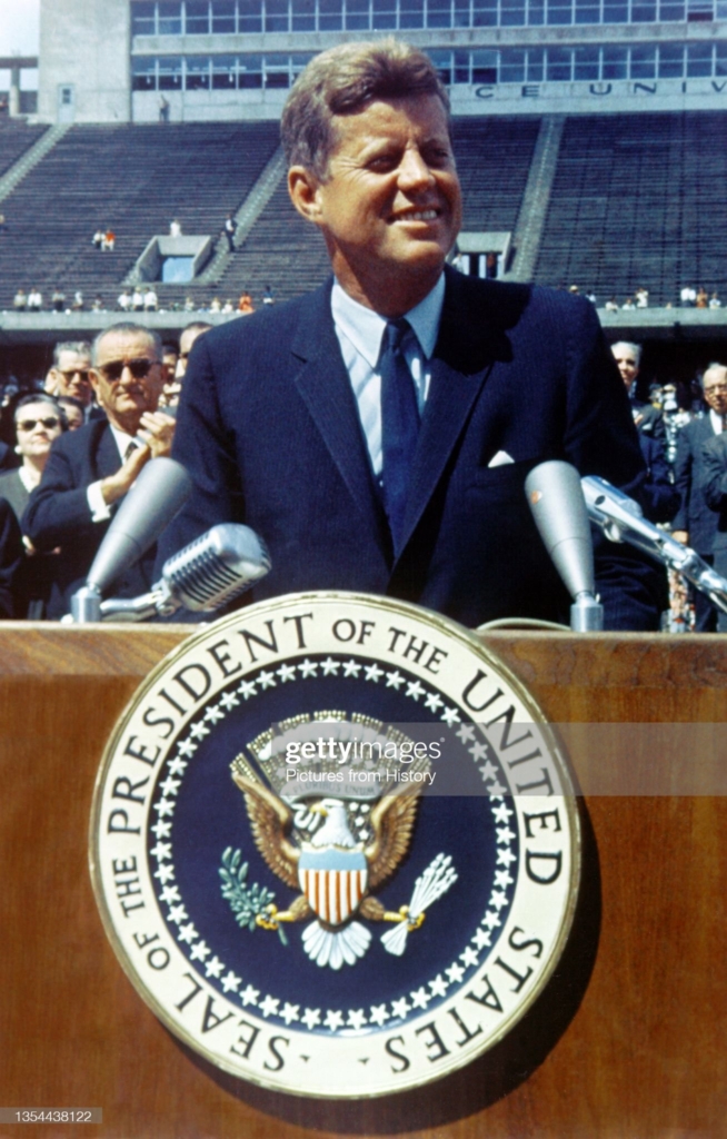 After military service during World War II in the South Pacific, Kennedy represented Massachusetts’s 11th congressional district in the U. S. House of Representatives from 1947 to 1953 as a Democrat. Thereafter, he served in the U. S. Senate from 1953 until 1960. Kennedy defeated then Vice President and Republican candidate Richard Nixon in the 1960 U. S. presidential election. He was the youngest elected to the office, at the age of 43, the second-youngest President (after Theodore Roosevelt), and the first president to have been born in the 20th century. Events during his presidency included the Bay of Pigs Invasion, the Cuban Missile Crisis, the building of the Berlin Wall, the Space Race, the African American Civil Rights Movement and early stages of the Vietnam War. Kennedy was assassinated on November 22, 1963, in Dallas, Texas. Lee Harvey Oswald was charged with the crime but was shot and killed two days later by Jack Ruby before any trial. Today, Kennedy continues to rank highly in public opinion ratings of former U. S. presidents. (Photo by: Pictures From History/Universal Images Group via Getty Images).”