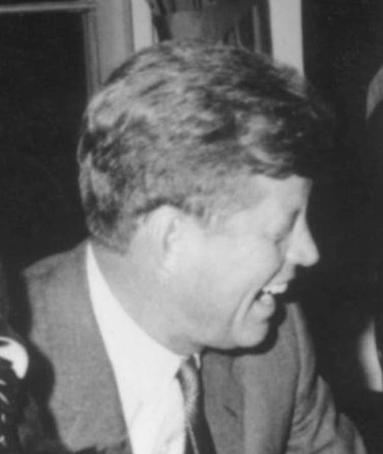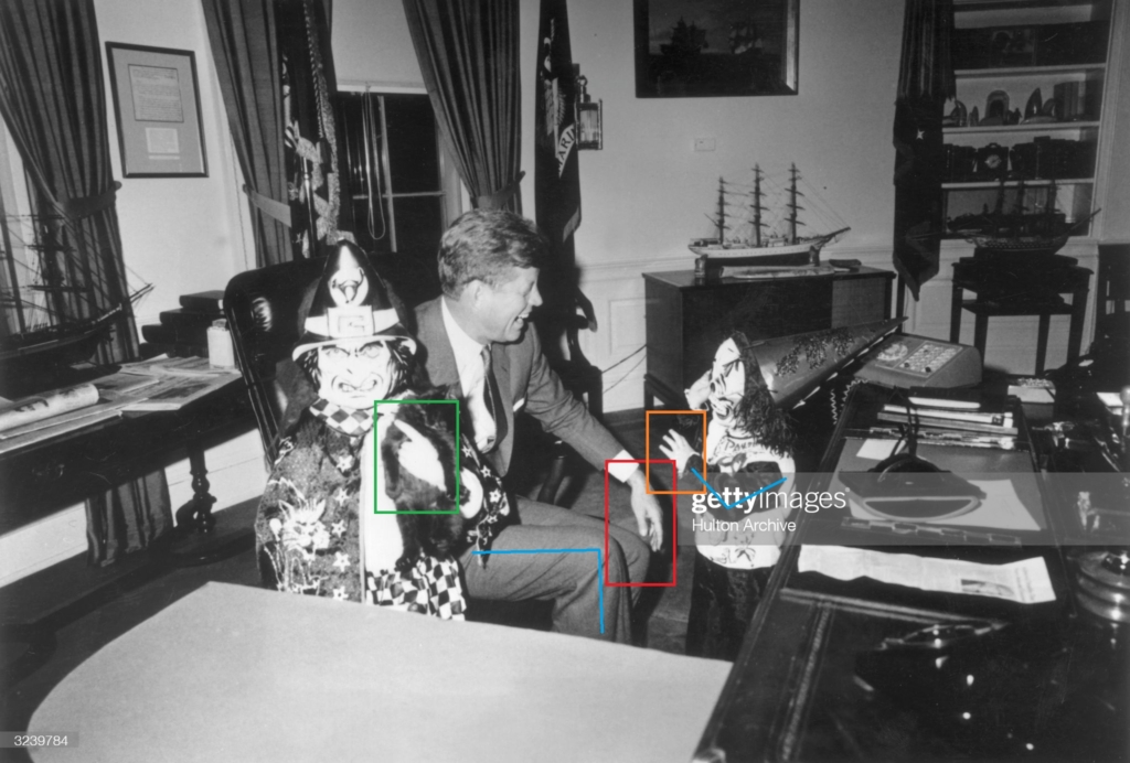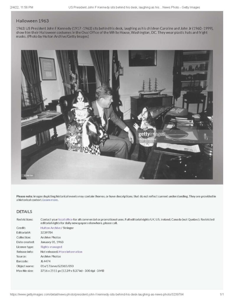 1963: US President John F Kennedy (1917 -1963) sits behind his desk, laughing as his children Caroline and John Jr (1960 -1999), show him their Halloween costumes in the Oval Office of the White House, Washington, DC. They wear plastic hats and fright masks. (Photo by Hulton Archive/Getty Images).”