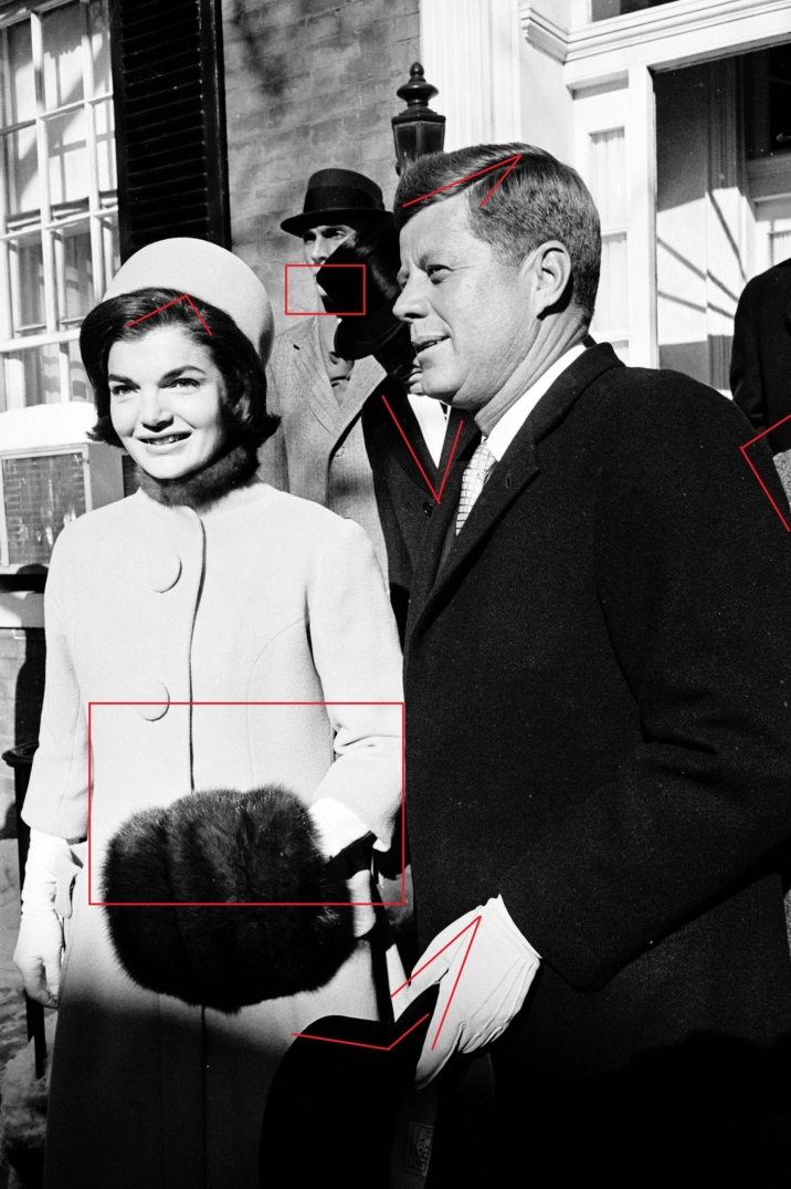 “Jacqueline Kennedy, wearing one of the pillbox hats that became a signature look for her, poses for photos with husband John F. Kennedy as he prepared to be inaugurated in 1961. Washington had been buffeted by a heavy snowstorm the day before, but the sun shined brightly as he took the oath. Paul Schutzer via Getty Images.”