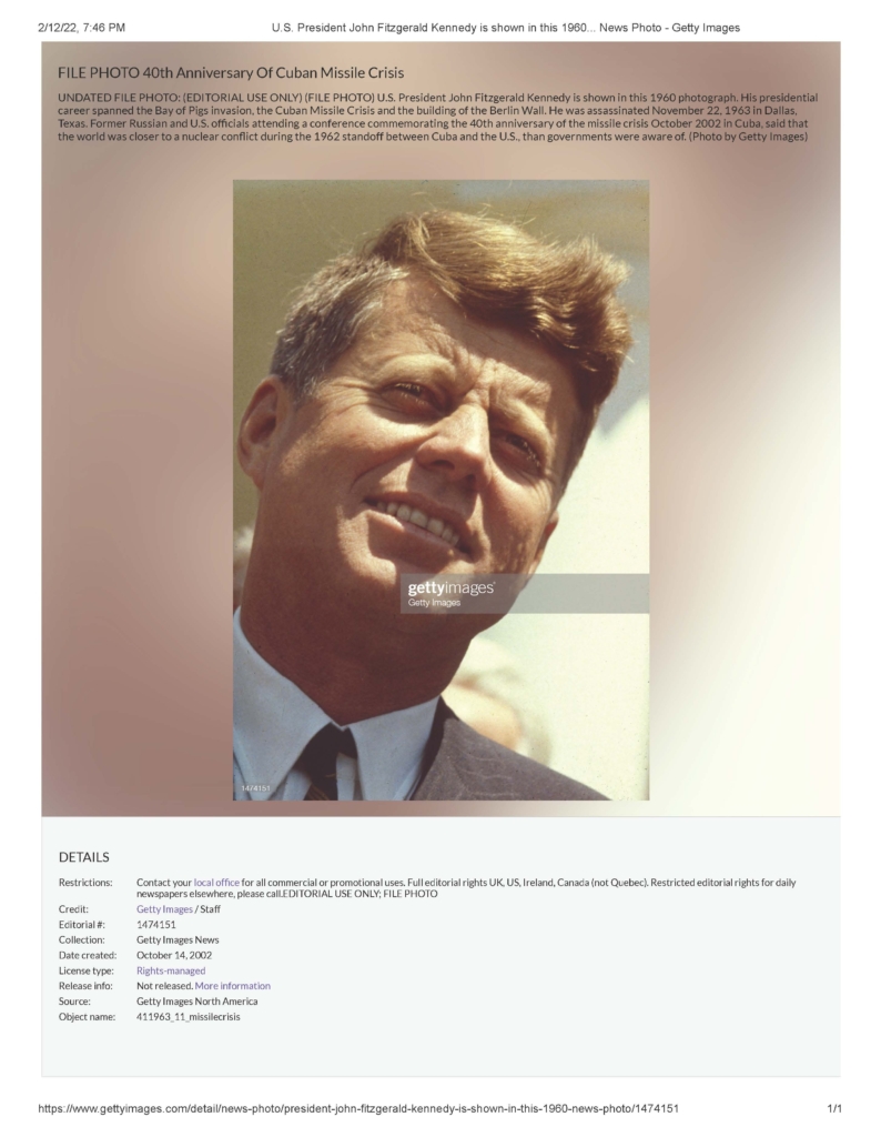 UNDATED FILE PHOTO: (EDITORIAL USE ONLY) (FILE PHOTO) U.S. President John Fitzgerald Kennedy is shown in this 1960 photograph. His presidential career spanned the Bay of Pigs invasion, the Cuban Missile Crisis and the building of the Berlin Wall. He was assassinated November 22, 1963 in Dallas, Texas. Former Russian and U.S. officials attending a conference commemorating the 40th anniversary of the missile crisis October 2002 in Cuba, said that the world was closer to a nuclear conflict during the 1962 standoff between Cuba and the U.S., than governments were aware of. (Photo by Getty Images). Date created: October 14, 2002.”