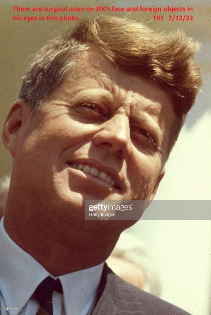 There are surgical scars on JFK’s face and foreign objects in his eyes in this photo.