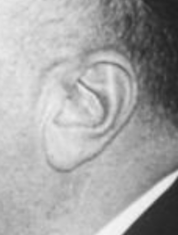 - RFK’s hair was darken to form a V.