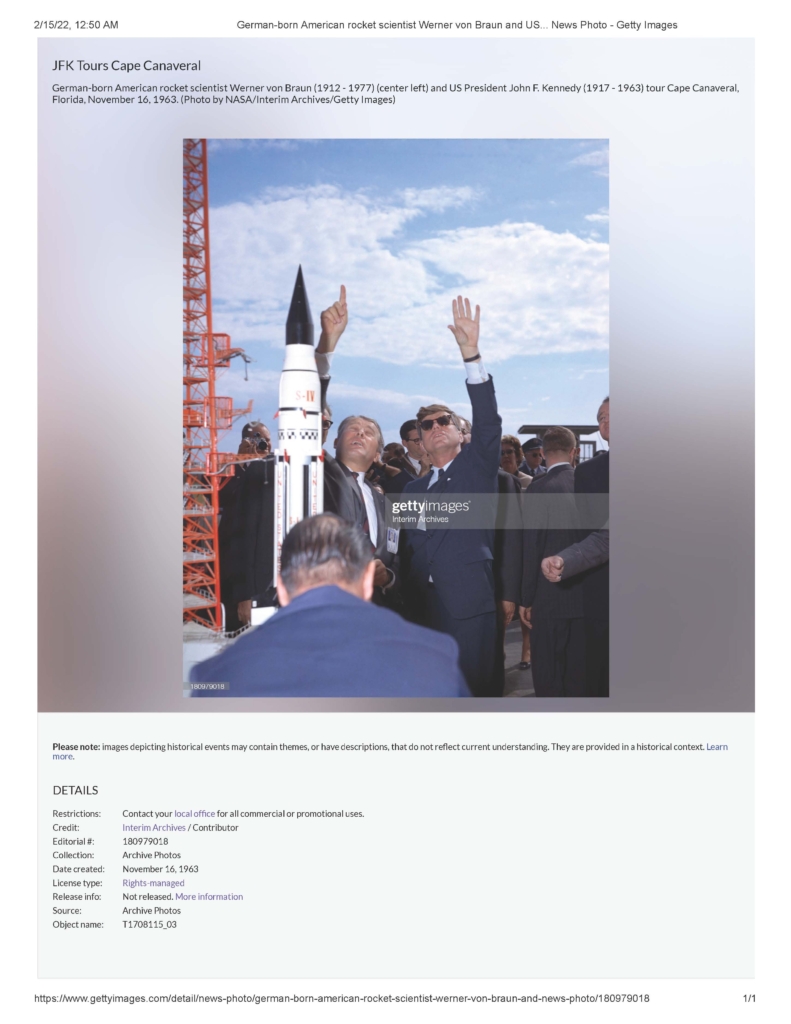 German-born American rocket scientist Werner von Braun (1912 – 1977) (center left) and US President John F. Kennedy (1917 – 1963) tour Cape Canaveral, Florida, November 16, 1963. (Photo by NASA/Interim Archives/Getty Images). Date created: November 16, 1963.”