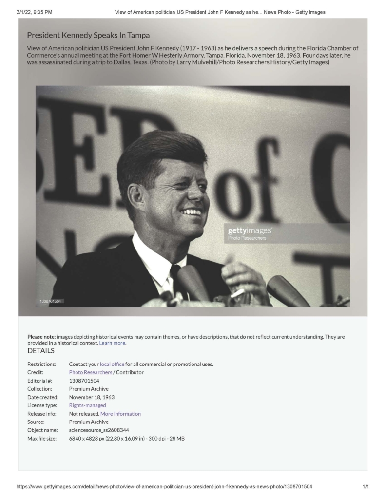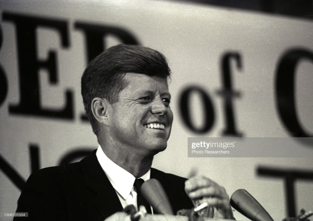 View of American politician US President John F Kennedy (1917 – 1963) as he delivers a speech during the Florida Chamber of Commerce’s annual meeting at the Fort Homer W Hesterly Armory, Tampa, Florida, November 18, 1963. Four days later, he was assassinated during a trip to Dallas, Texas. (Photo by Larry Mulvehill/Photo Researchers History/Getty Images). Date created: November 18, 1963.”