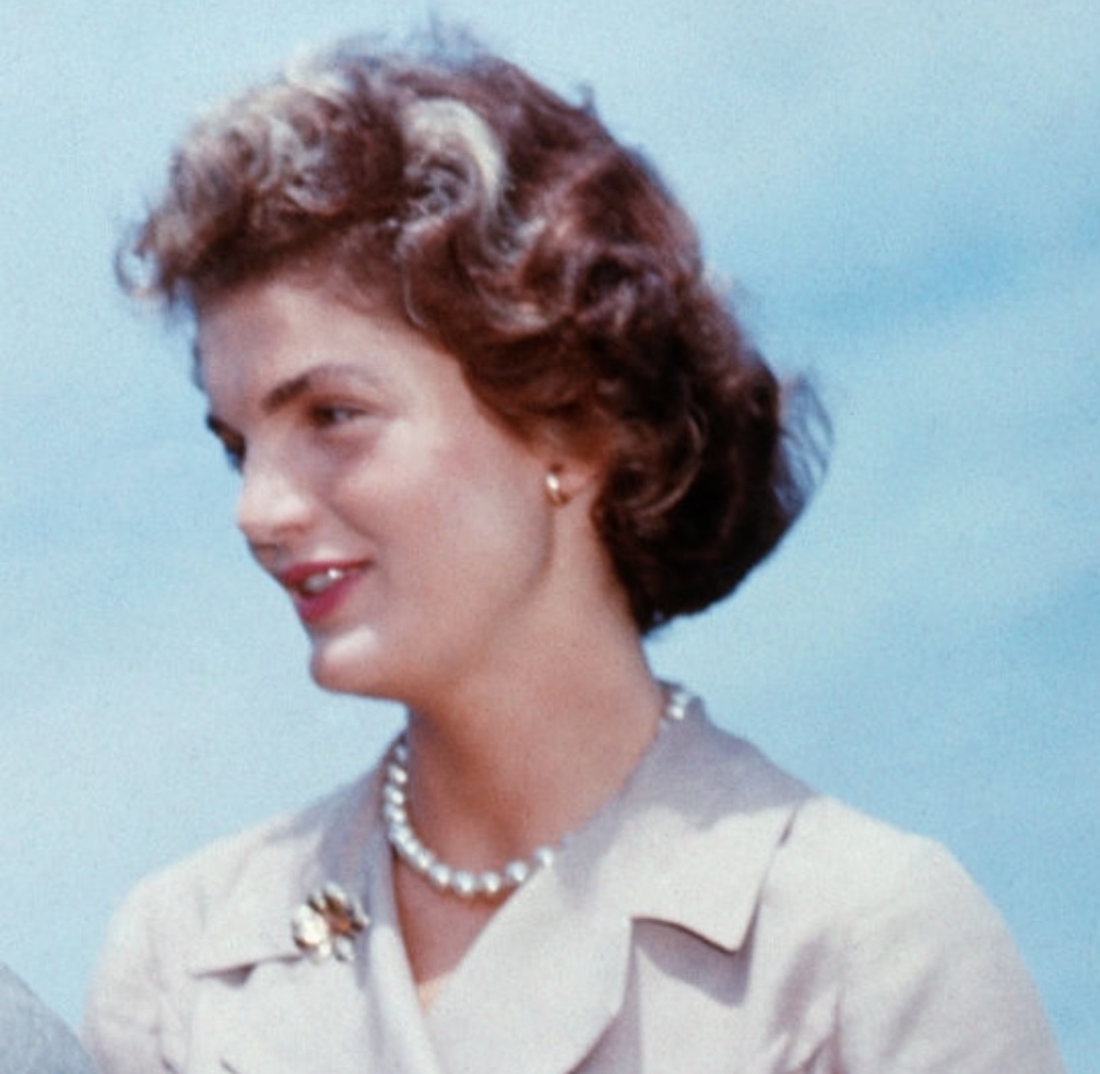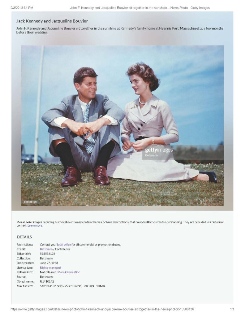 “John F. Kennedy and Jacqueline Bouvier sit together in the sunshine at Kennedy’s family home at Hyannis Port, Massachusetts, a few months before their wedding. Date created: June 27, 1953.”