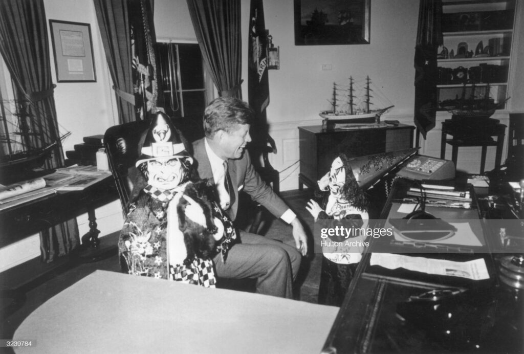 1963: US President John F Kennedy (1917 -1963) sits behind his desk, laughing as his children Caroline and John Jr (1960 -1999), show him their Halloween costumes in the Oval Office of the White House, Washington, DC. They wear plastic hats and fright masks. (Photo by Hulton Archive/Getty Images).”