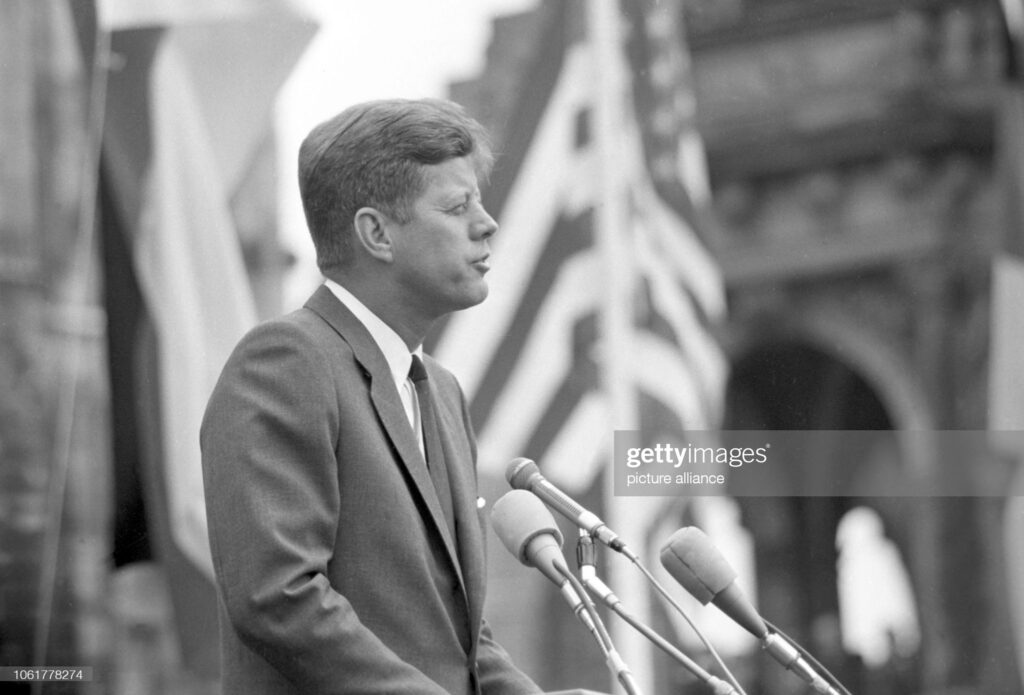 US president John F. Kennedy after his arrival on 26 June 1963 for a four days visit in Germany adressing an enthusiastic crowd in Cologne. (Photo by dpa Fotografen/picture alliance via Getty Images).”