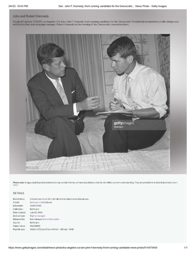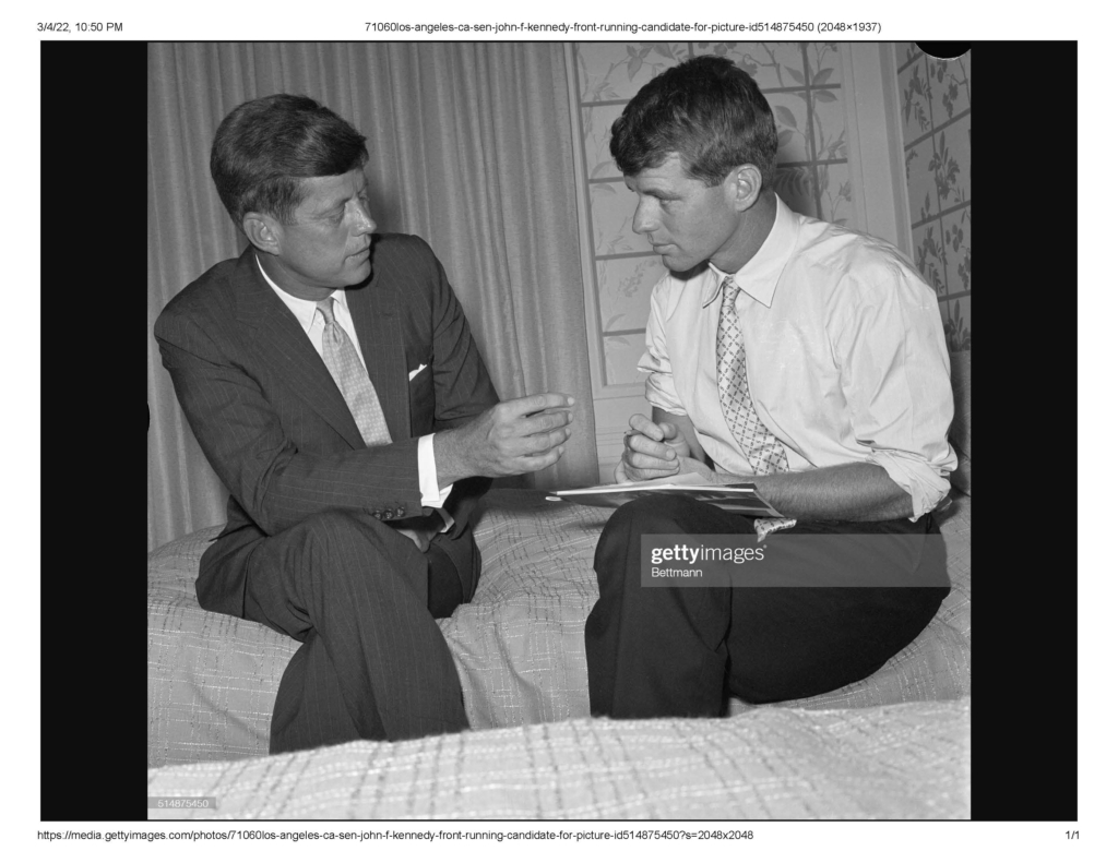 (Original Caption) 7/10/60-Los Angeles, CA: Sen. John F. Kennedy, front running candidate for the Democratic Presidential nomination (L) talks things over with his brother and campaign manager, Robert Kennedy on the evening of the Democratic convention here. Date created: July 10, 1960.”