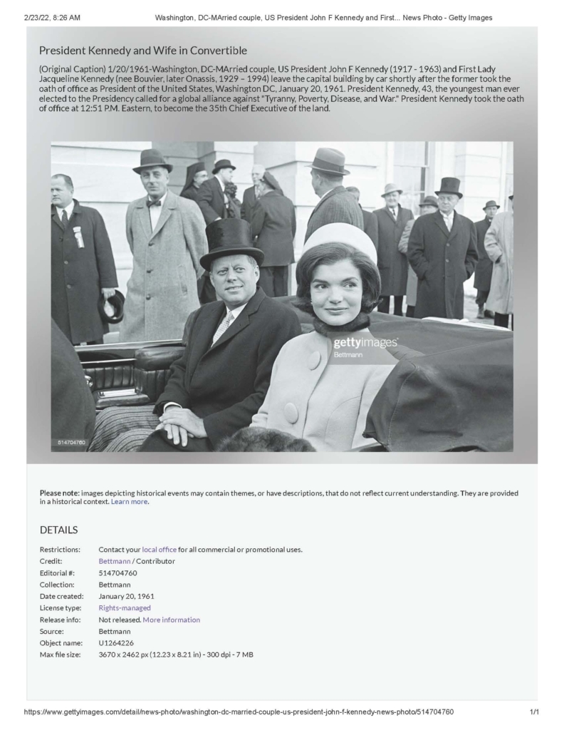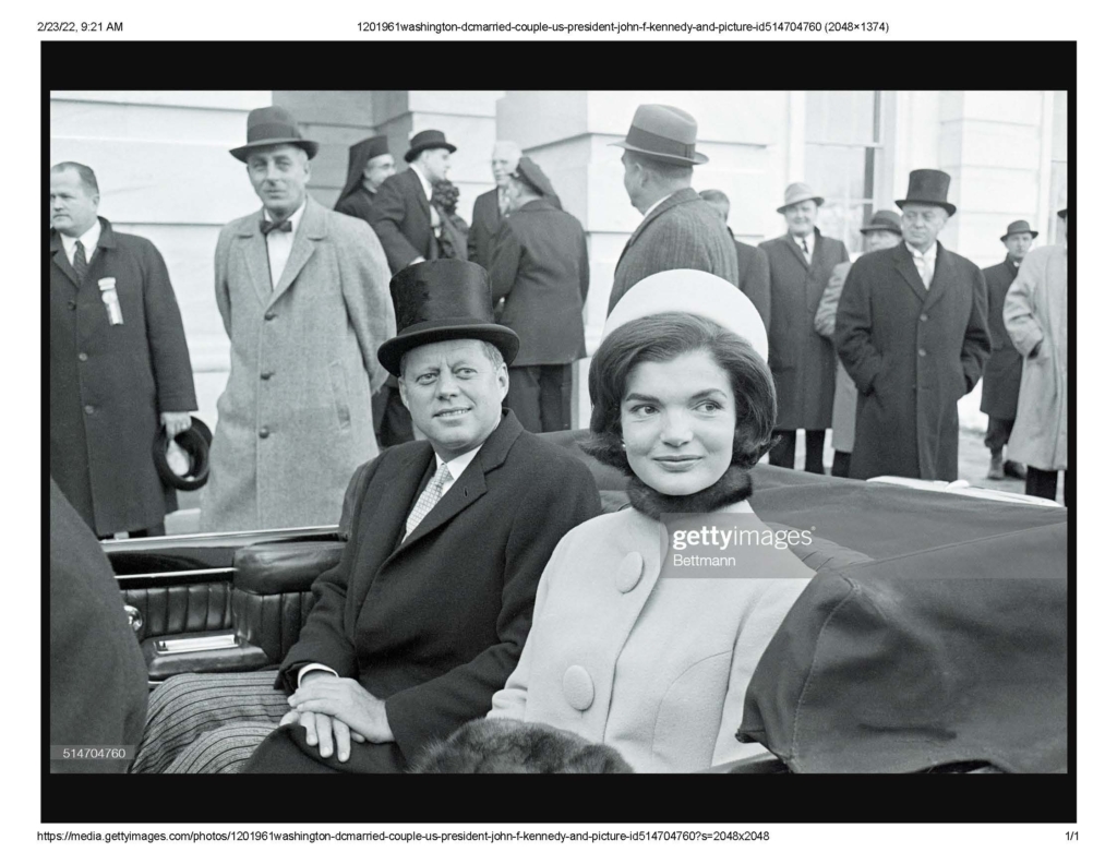 (Original Caption) 1/20/1961-Washington, DC-MArried couple, US President John F Kennedy (1917 – 1963) and First Lady Jacqueline Kennedy (nee Bouvier, later Onassis, 1929 – 1994) leave the capital building by car shortly after the former took the oath of office as President of the United States, Washington DC, January 20, 1961. President Kennedy, 43, the youngest man ever elected to the Presidency called for a global alliance against ‘Tyranny, Poverty, Disease, and War.’ President Kennedy took the oath of office at 12:51 P.M. Eastern, to become the 35th Chief Executive of the land. Date created: January 20, 1961.”