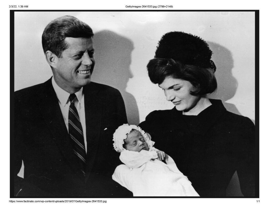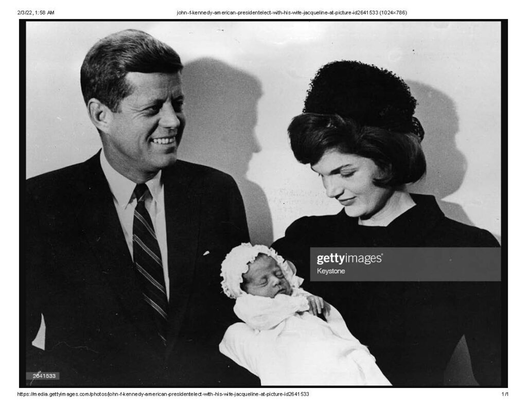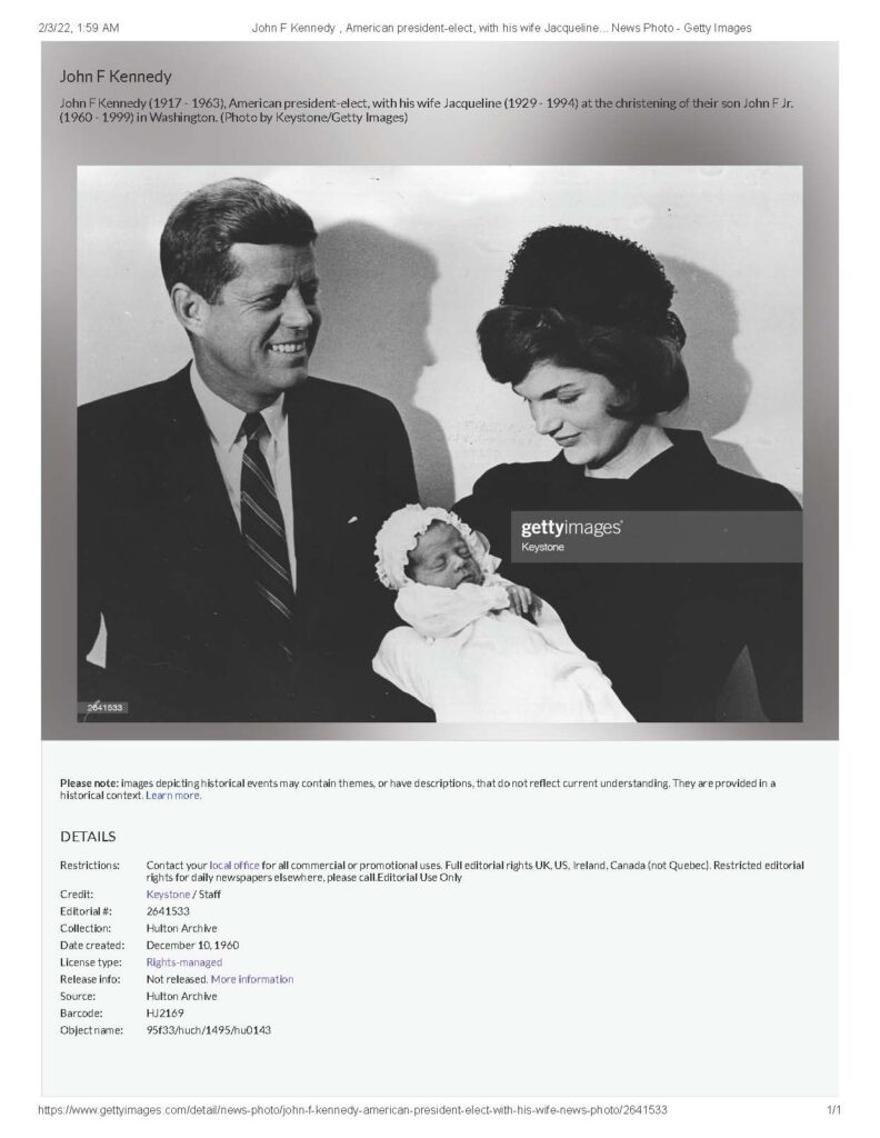 “John F Kennedy (1917 – 1963), American president-elect, with his wife Jacqueline (1929 – 1994) at the christening of their son John F Jr. (1960 – 1999) in Washington. (Photo by Keystone/Getty Images).