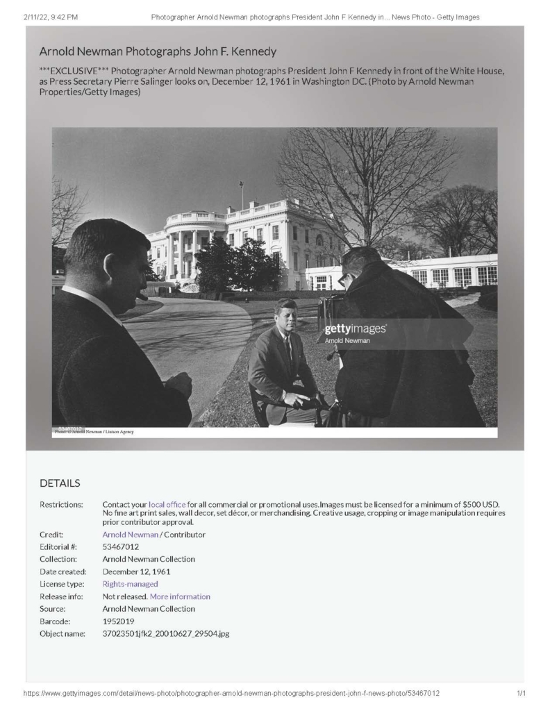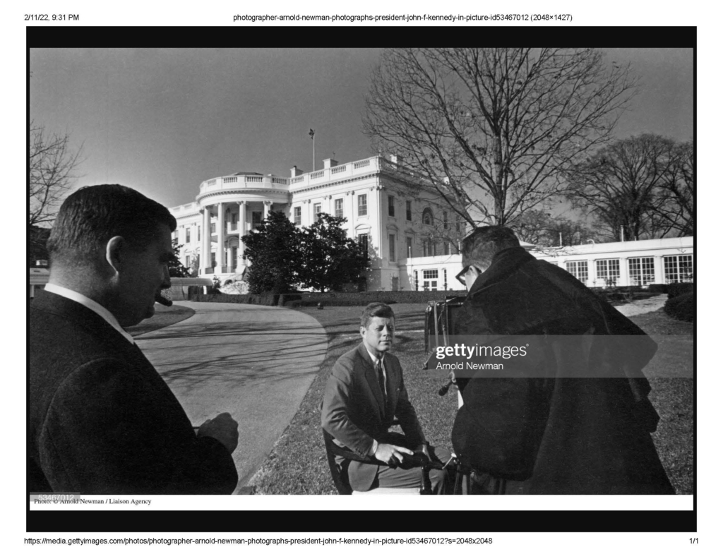 EXCLUSIVE Photographer Arnold Newman photographs President John F Kennedy in front of the White House, as Press Secretary Pierre Salinger looks on, December 12, 1961 in Washington DC. (Photo by Arnold Newman Properties/Getty Images). Date created: December 12, 1961.”
