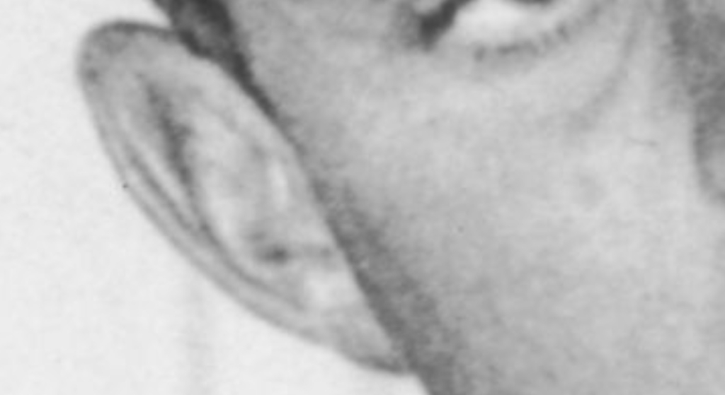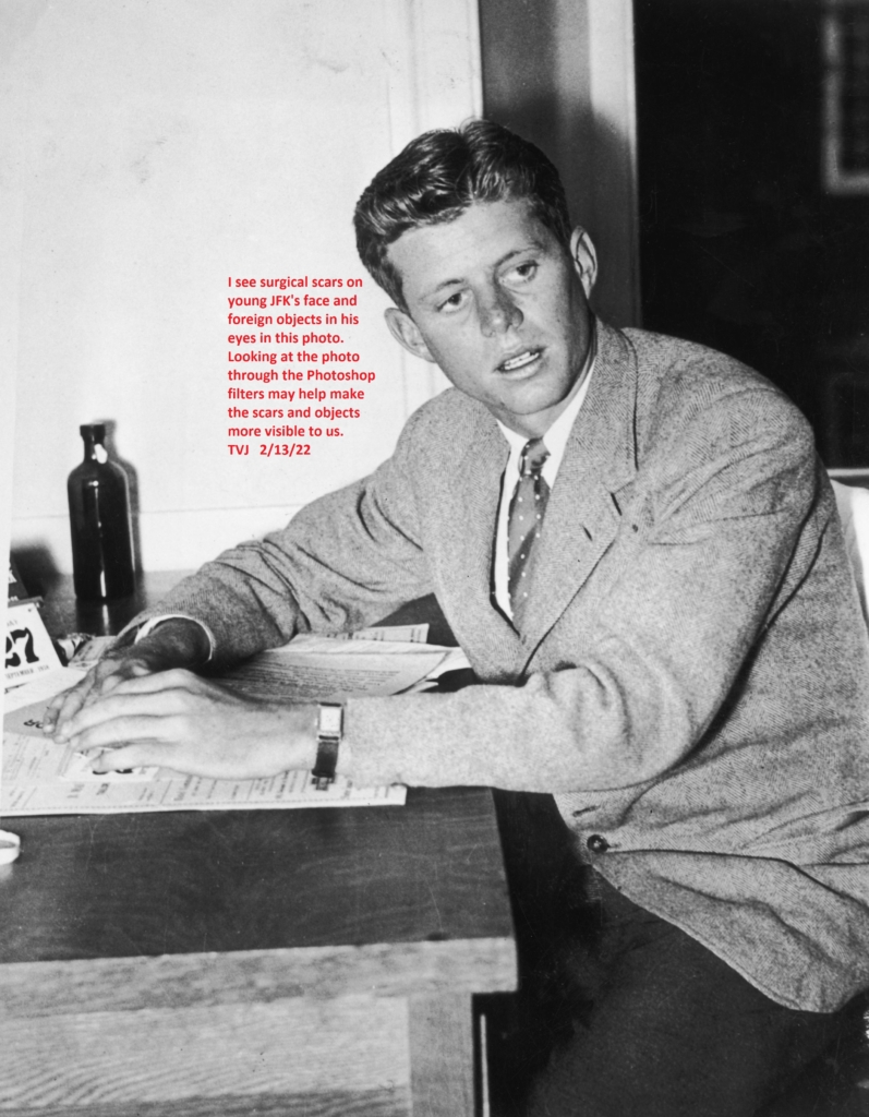 I see surgical scars on young JFK’s face and foreign objects in his eyes in this photo. Looking at the photo through the Photoshop filters may help make the scars and objects more visible to us.