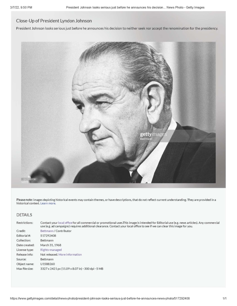 President Johnson looks serious just before he announces his decision to neither seek nor accept the renomination for the presidency. Date created: