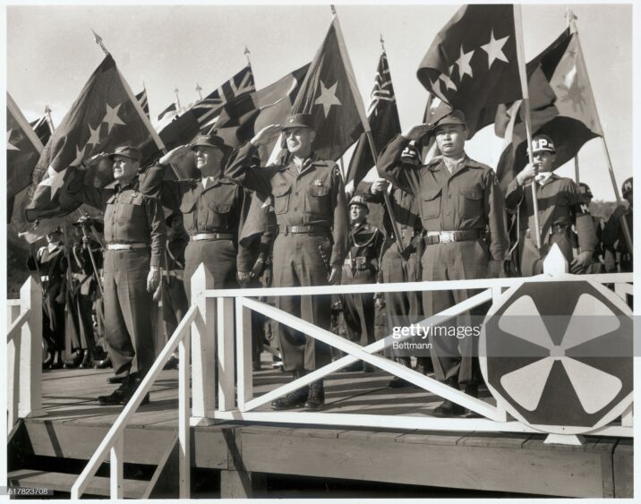 (Original Caption) Against a background of flags of the nations who have troop contingents in Korea, a foursome of Four Star Generals takes the salute at the review of more than 6,000 troops from 15 nations at Ninth-Army-Headquarters. From left are General Matthew B. Ridgeway, U.S. Army Chief of staff who formerly commanded the 8th Army and later was Supreme UN Commander; General John E. Hull, present Supreme Commander in the far east; General Maxwell Taylor, commander of the 8th Army and General Sun Yup Paik, South Korean Army chief of Staff. General Ridgeway called the United Nations force ‘incredible progress.'”