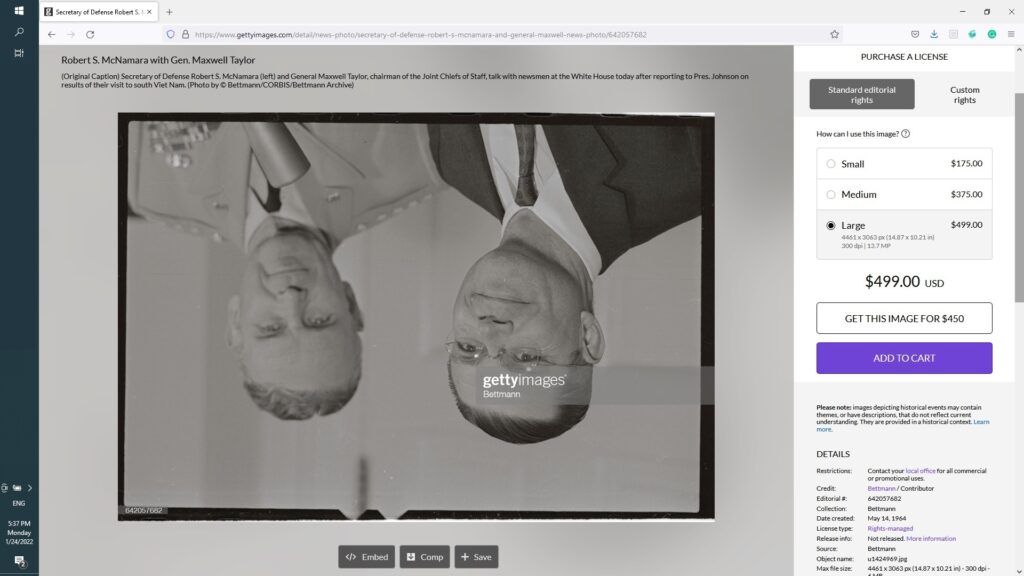 (Original Caption) Secretary of Defense Robert S. McNamara (left) and General Maxwell Taylor, chairman of the Joint Chiefs of Staff, talk with newsmen at the White House today after reporting to Pres. Johnson on results of their visit to South Viet Nam. (Photo by © Bettmann/CORBIS/Bettmann Archive).”