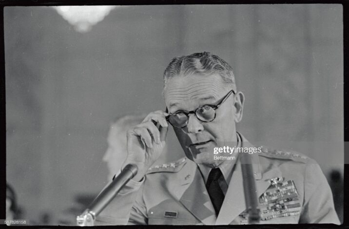 “(Original Caption) General Maxwell D. Taylor, Chairman of the Joint Chiefs of Staff, is shown as he appeared before the Senate Foreign Relations Committee in support of the limited nuclear test ban treaty today. Taylor said that he and other Joint Chiefs were kept constantly abreast on negotiations on the treaty and were not subjected to Administration pressures for their approval of the pact. Members of the Senate Armed Services and Joint Atomic Energy Committees were also invited to the hearing.”