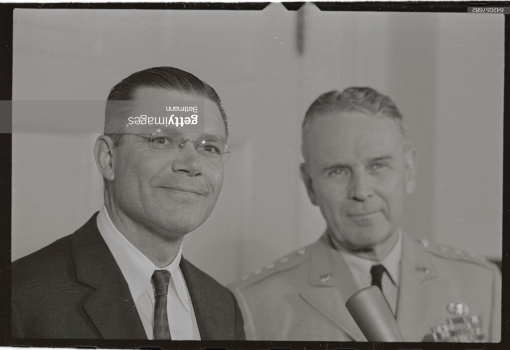 (Original Caption) Secretary of Defense Robert S. McNamara (left) and General Maxwell Taylor, chairman of the Joint Chiefs of Staff, talk with newsmen at the White House today after reporting to Pres. Johnson on results of their visit to south Viet Nam. (Photo by © Bettmann/CORBIS/Bettmann Archive).”